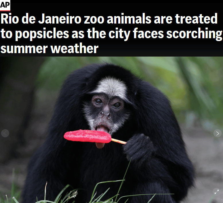 Rio hit brutal heat—over 40°C—and the BioParque zoo started handing out frozen treats to help animals cool down. Monkeys got fruit popsicles, and the jaguar got frozen ground chicken in water so she’d hydrate while “fishing” it out.